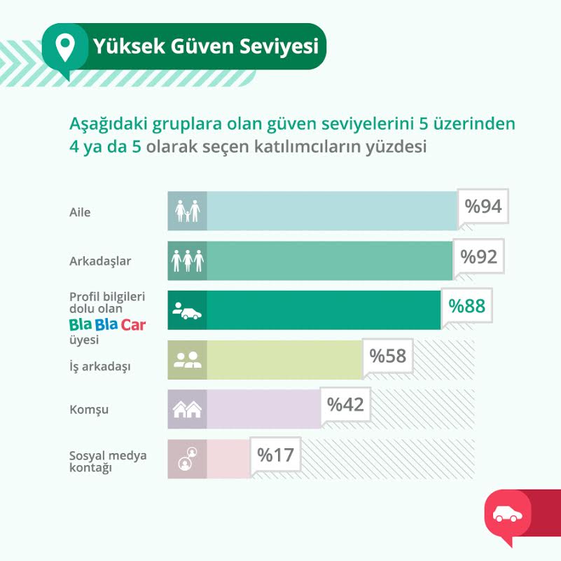 Güven BlaBlaCar Güven Araştırması BlaBlaCar ve New York Üniversitesi'nin ortak yürüttüğü Güven Araştırması'na göre online arkadaşlıklara olan güven, komşu ve iş arkadaşlıklarını geride bırakıyor.